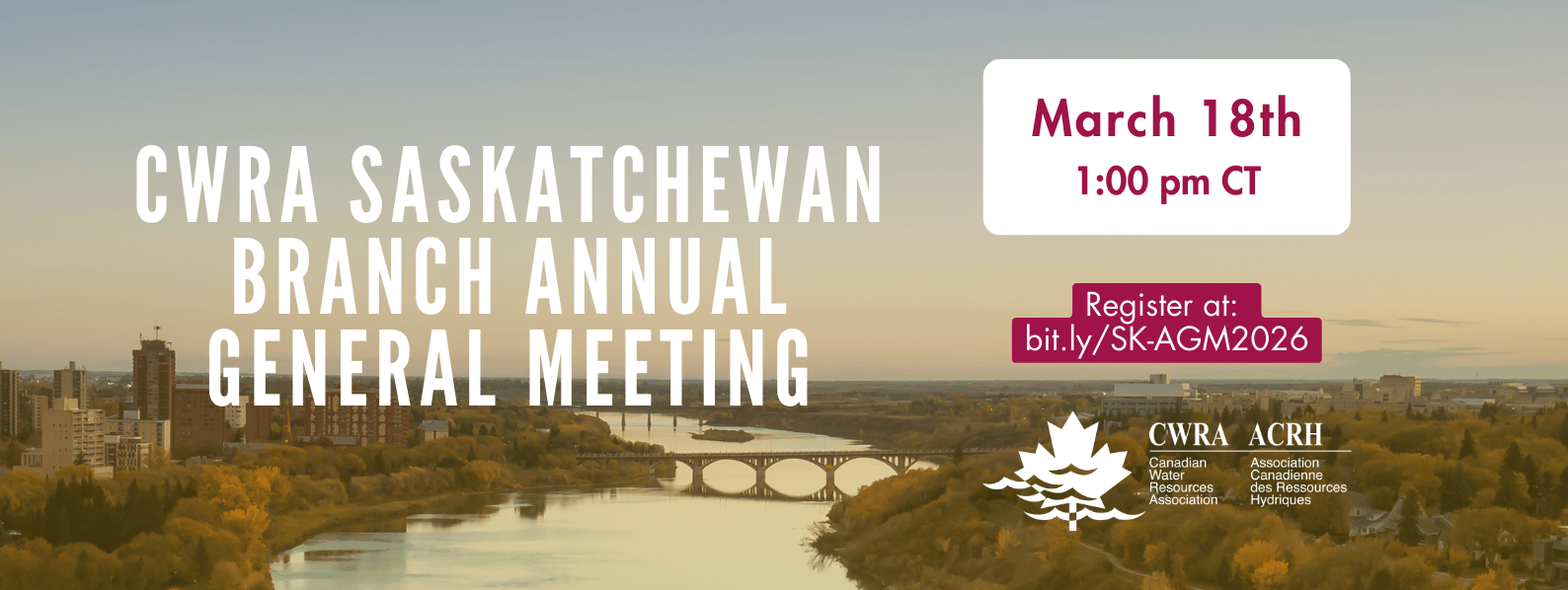 March 18, 2026: SK Branch: AGM By CWRA Webmaster Posted In Archived AGM, Archived SK March 18, 2026: SK Branch: AGM2026-03-152026-03-23https://cwra.org/wp-content/uploads/2019/10/cwra_logo-full-colour_white-background.jpgCanadian Water Resources Associationhttps://cwra.org/wp-content/uploads/2026/03/1.png200px200px What: SK Branch AGM When: March 18th, 2026 @ 1 pm CT Where: Google Meet