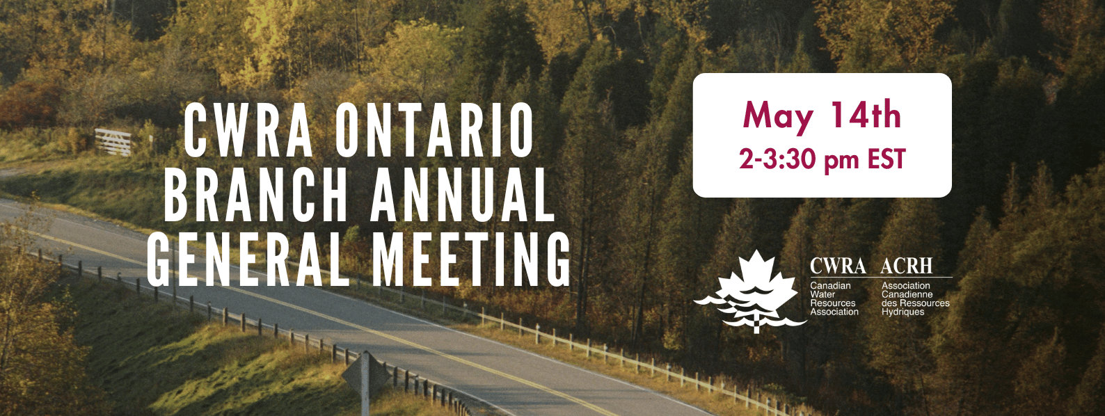 The Annual General Meeting of the Canadian Water Resources Association Ontario Branch for 2026 will be held on Thursday, May 14 from 2:00 – 3:30 pm. An official agenda and materials will be circulated to Ontario CWRA Members by email and available on the Ontario Branch page soon.